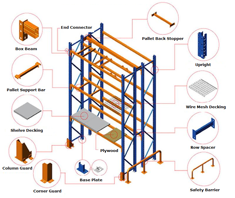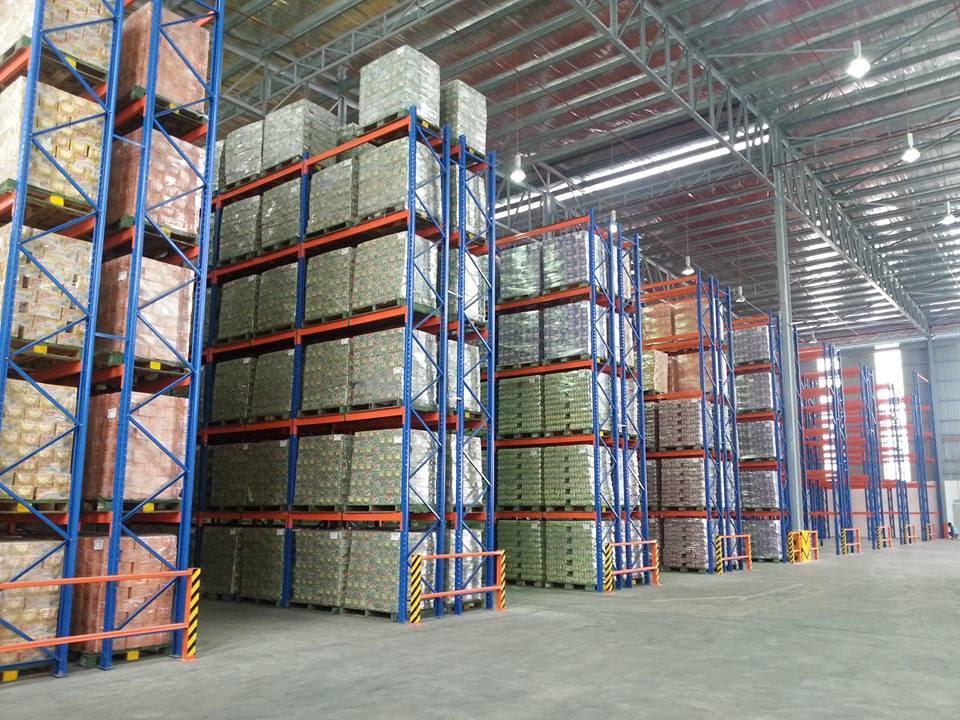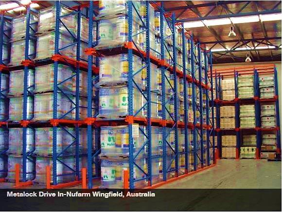 Drive-In racking, which consists of multiple rows of racking with no aisle between each row. Vehicular access is only from the front end of each row of the racks while there is no access from the back end. The width within each row of racking is wide enough for vehicular access such as a forklift to drive into the row to load/unload goods. Loads are stored in tandem within each row of racks thus facilitating last-in-first-out inventory movement.