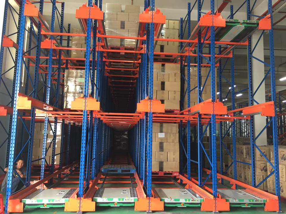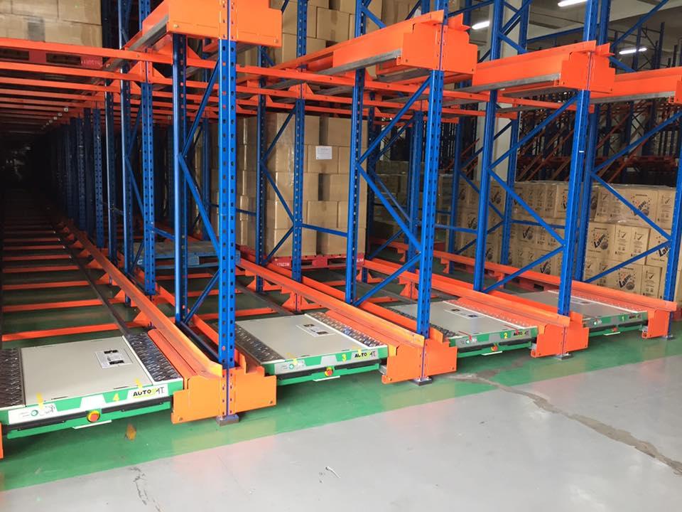 Satellite system, which is a semi-automated system where pallet racks are stored or retrieved using a pallet carrier that is driven by an electric motor and runs on rails installed onto the racking system. Operators are required to use forklifts to move the shuttles between different levels and control the motorised carrier’s activity through a handheld remote.