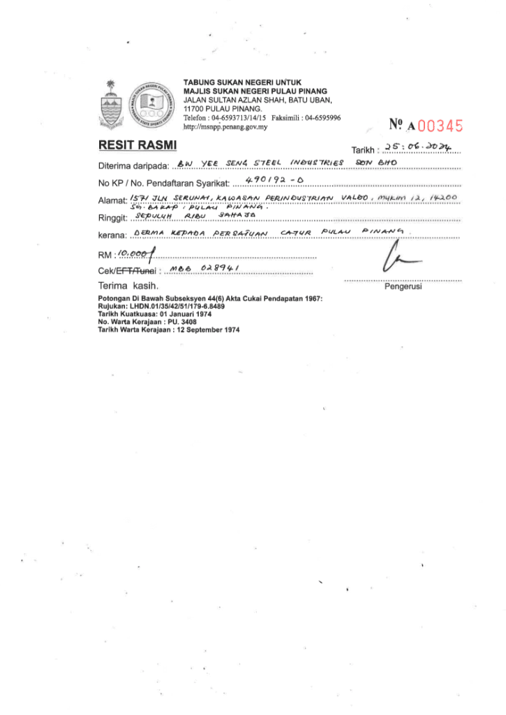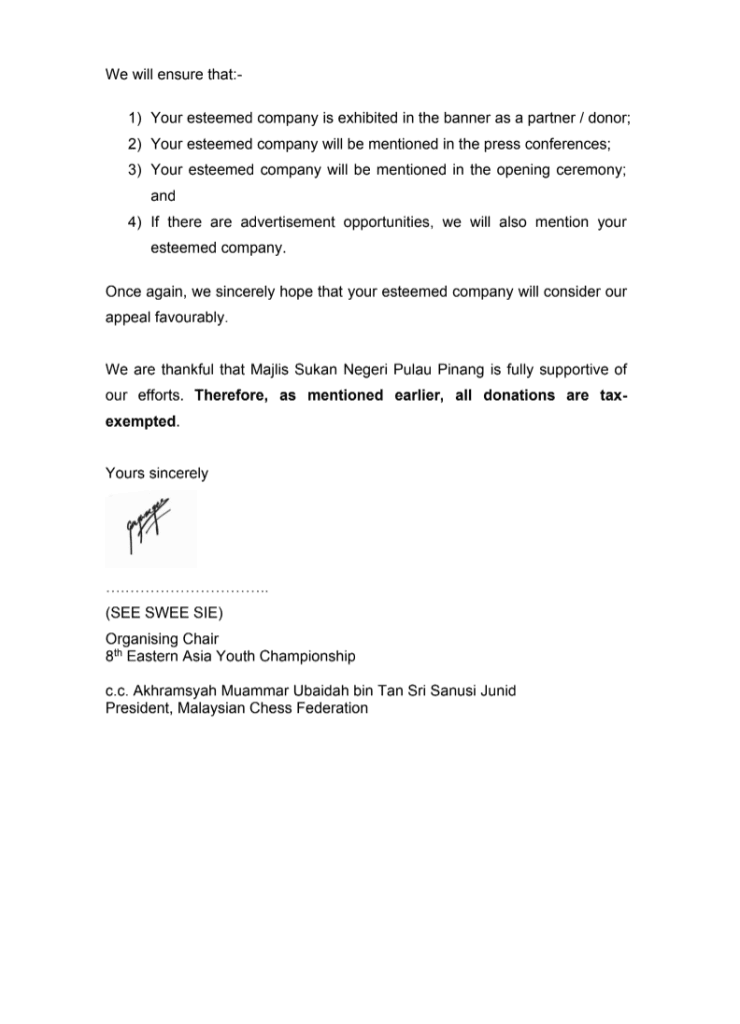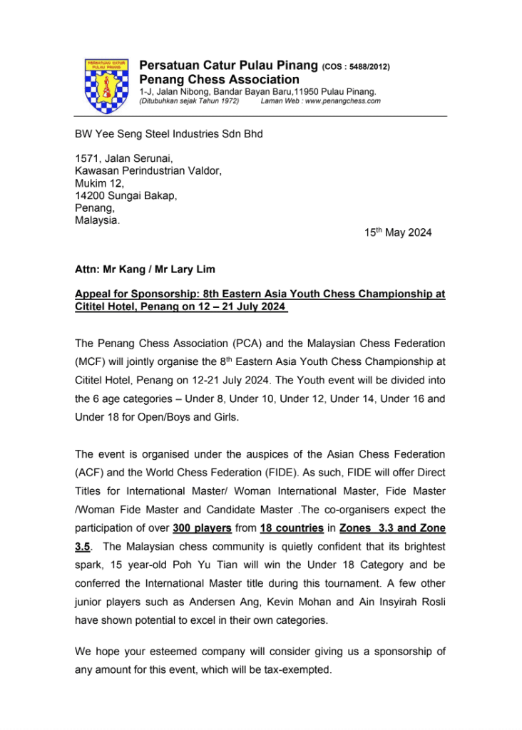 12 to 21 July 2024 - Sponsorship of RM10,000.00 for Eastern Asia Youth Chess Championship 2024 (EAYCC)