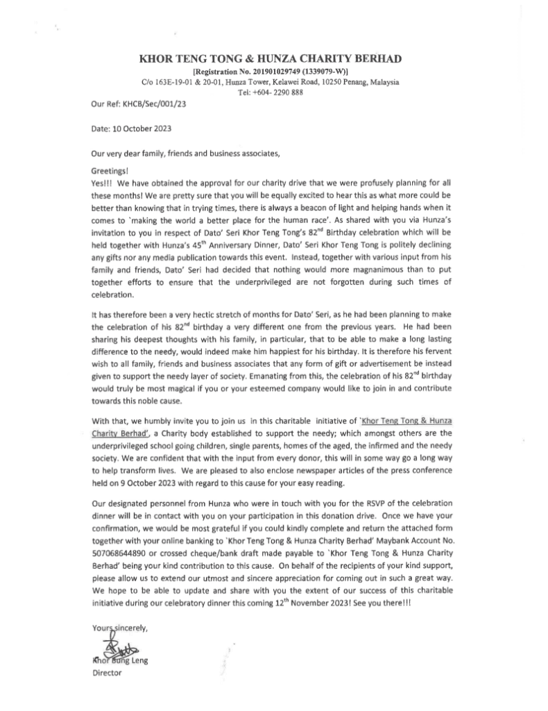 6 November 2023 – Donation of RM5,000.00 to Khor Teng Tong & Hunza Charity Berhad.